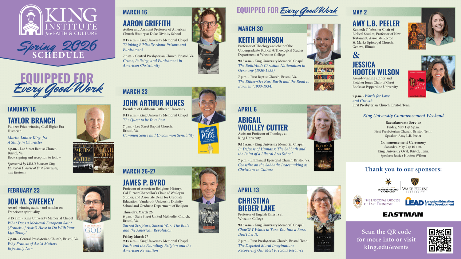 Cultivating this ground is the work of the King University Institute for Faith & Culture. Since 2007, the Institute has welcomed widely recognized thinkers, authors, musicians, scholars, and philosophers to interact with students and a regional audience in a welcoming environment that catalyzes growth and understanding. The Institute serves as the standard bearer of the University’s long-time exploration of the liberal arts — in conjunction with King’s mission of equipping students to answer the call of excellence inherent in the Christian faith.